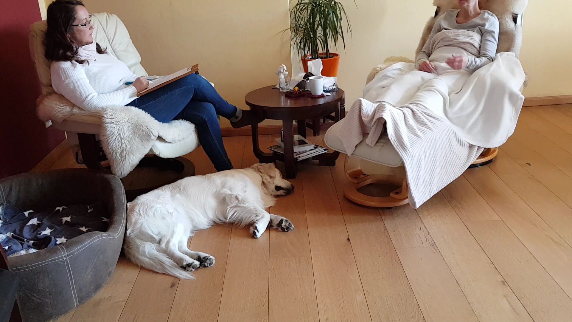 Ich schicke auch mal ein paar Fotos mit von unserer Arbeit in der Praxis mit Erwachsenen (Hypnose, Entspannung).